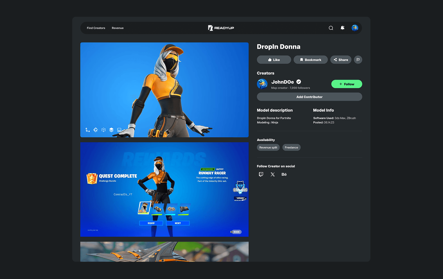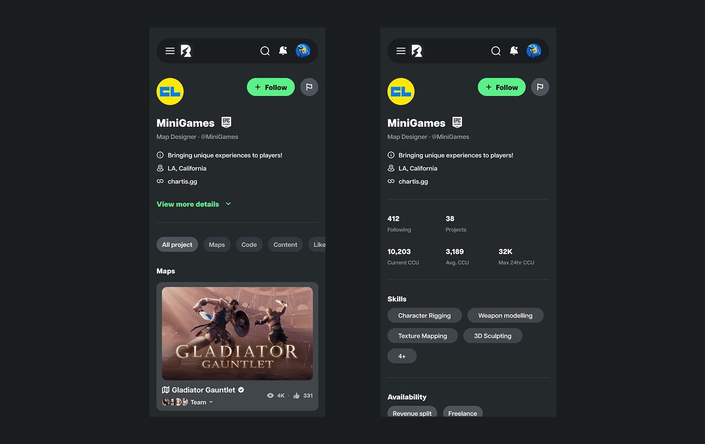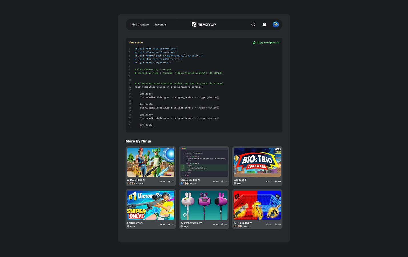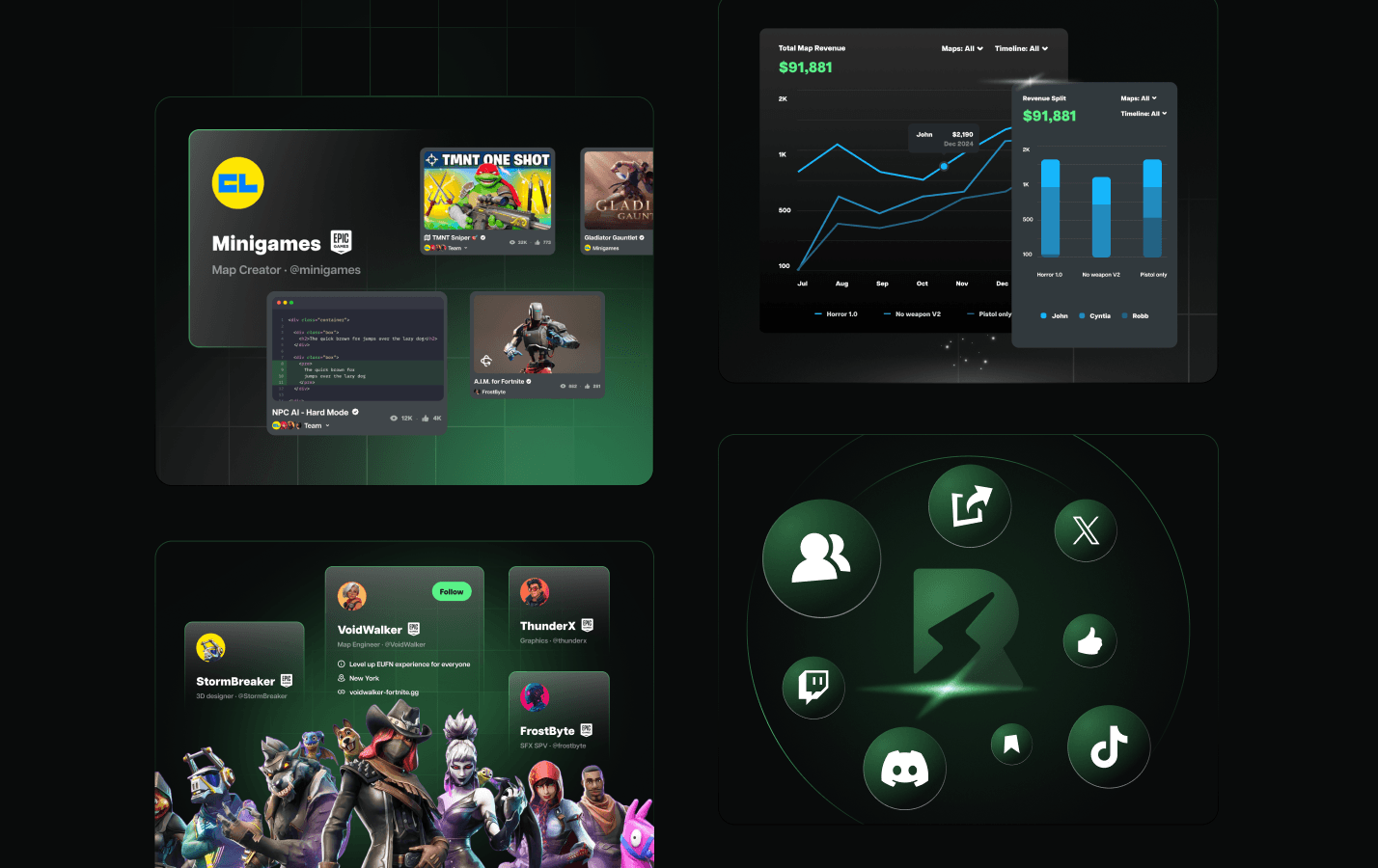 Social platform and tools built for Fortnite Creators, users can showcase their 3D builds, game maps, trailers, and more. As founding designer, I was responsible to led design the interface, pitch deck and graphics assets.