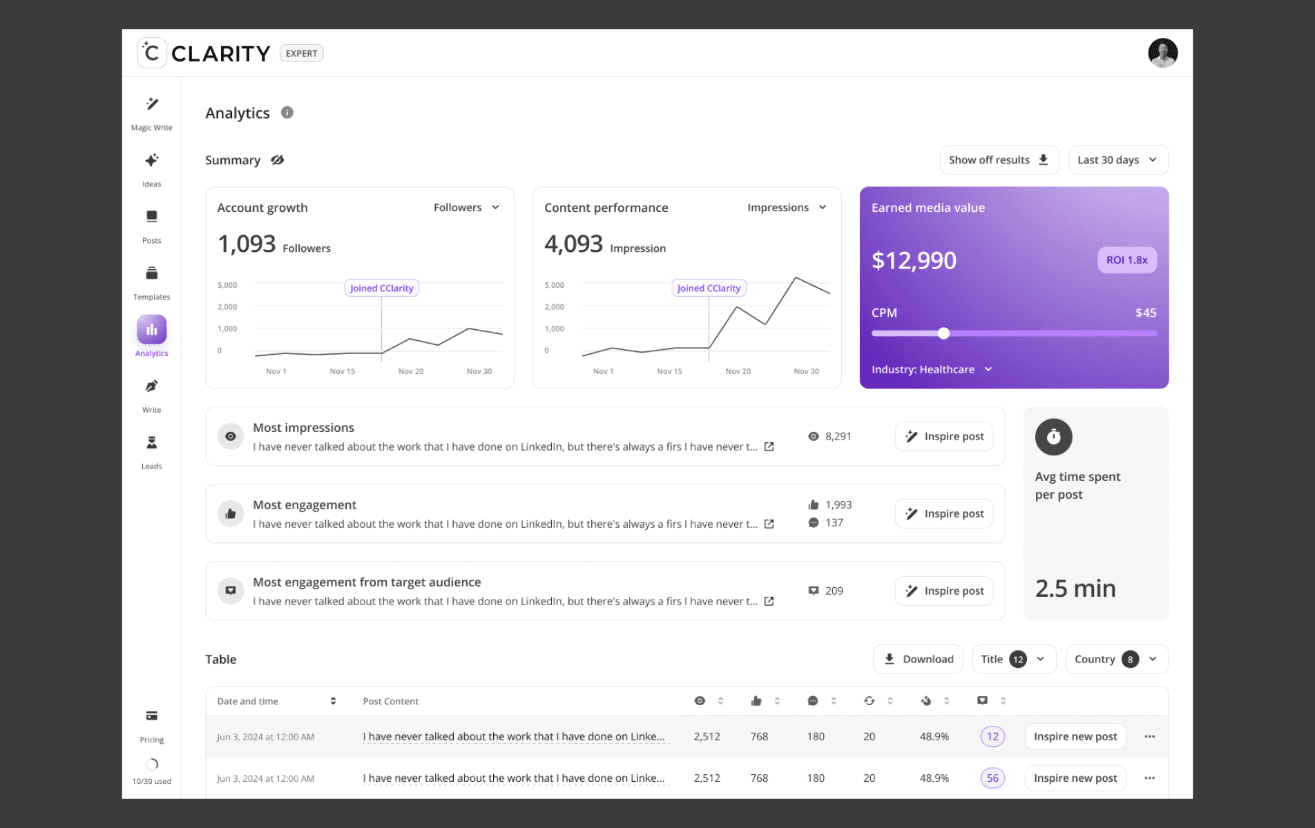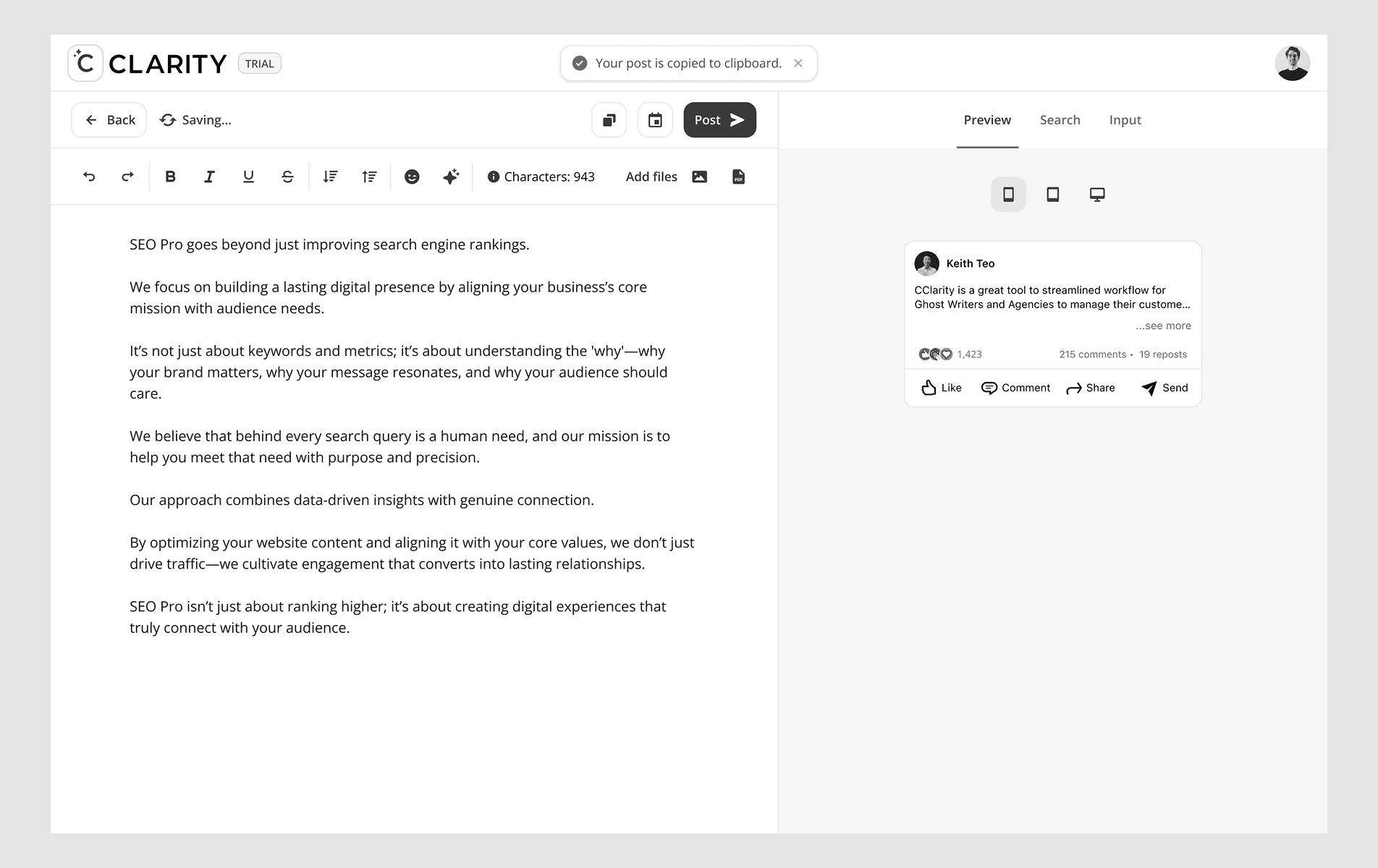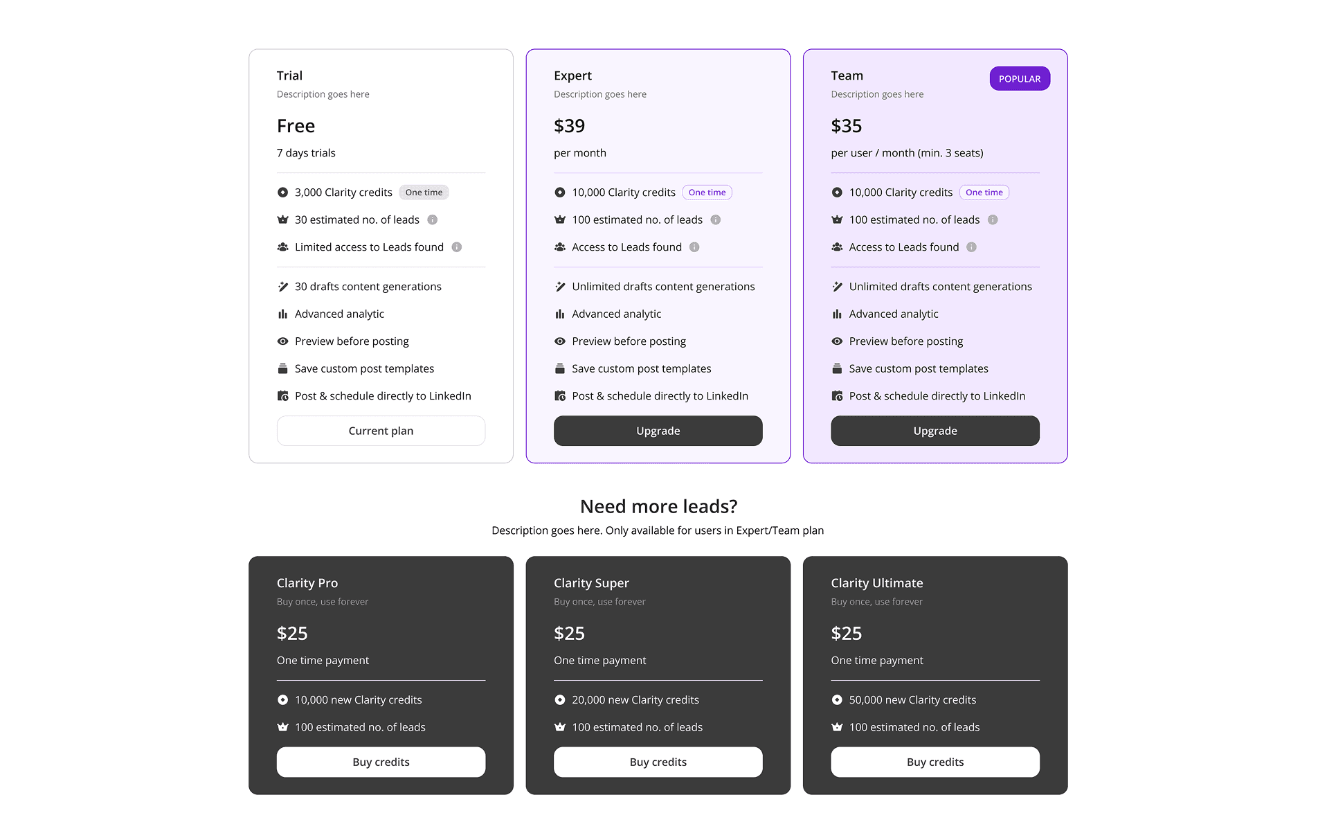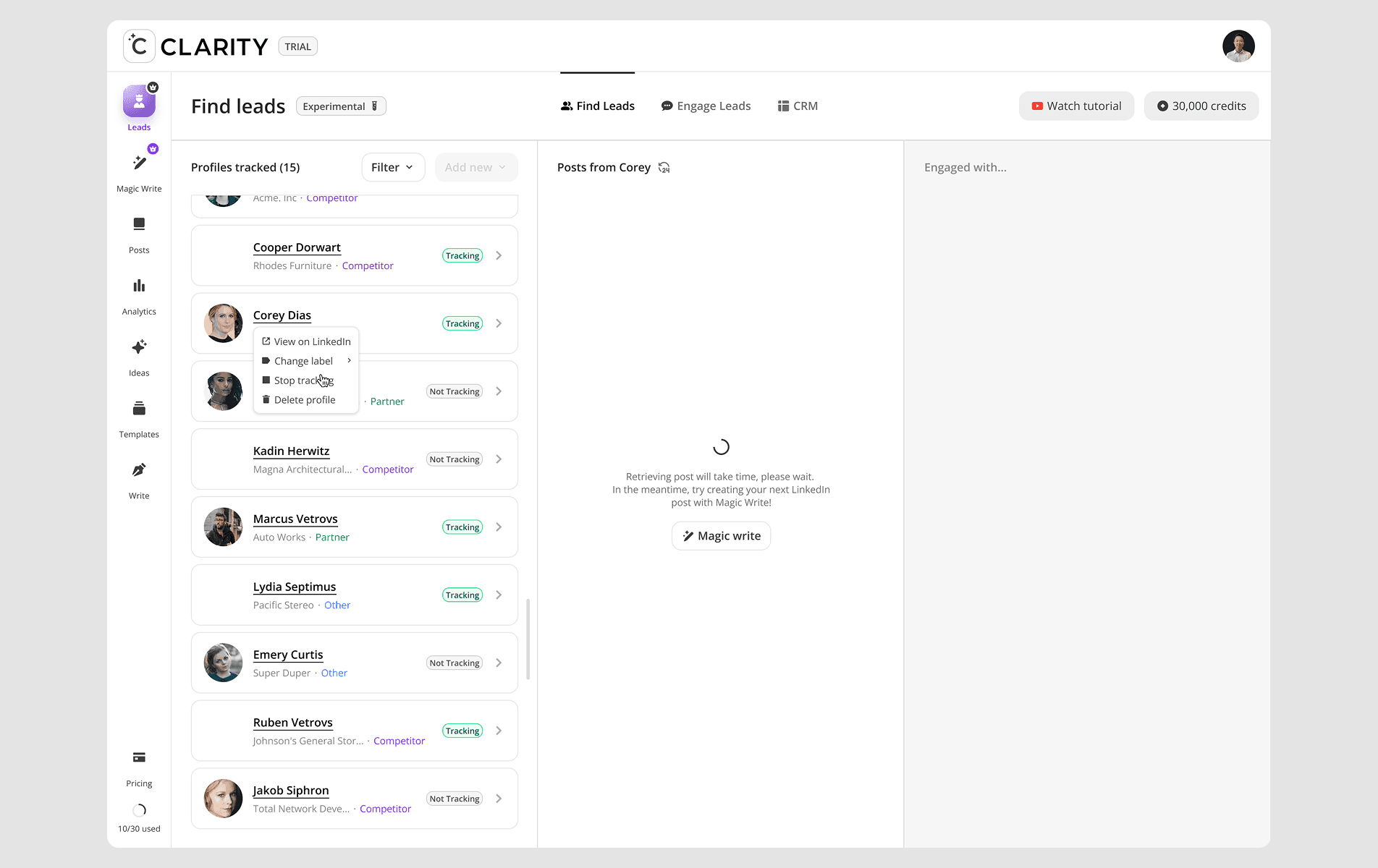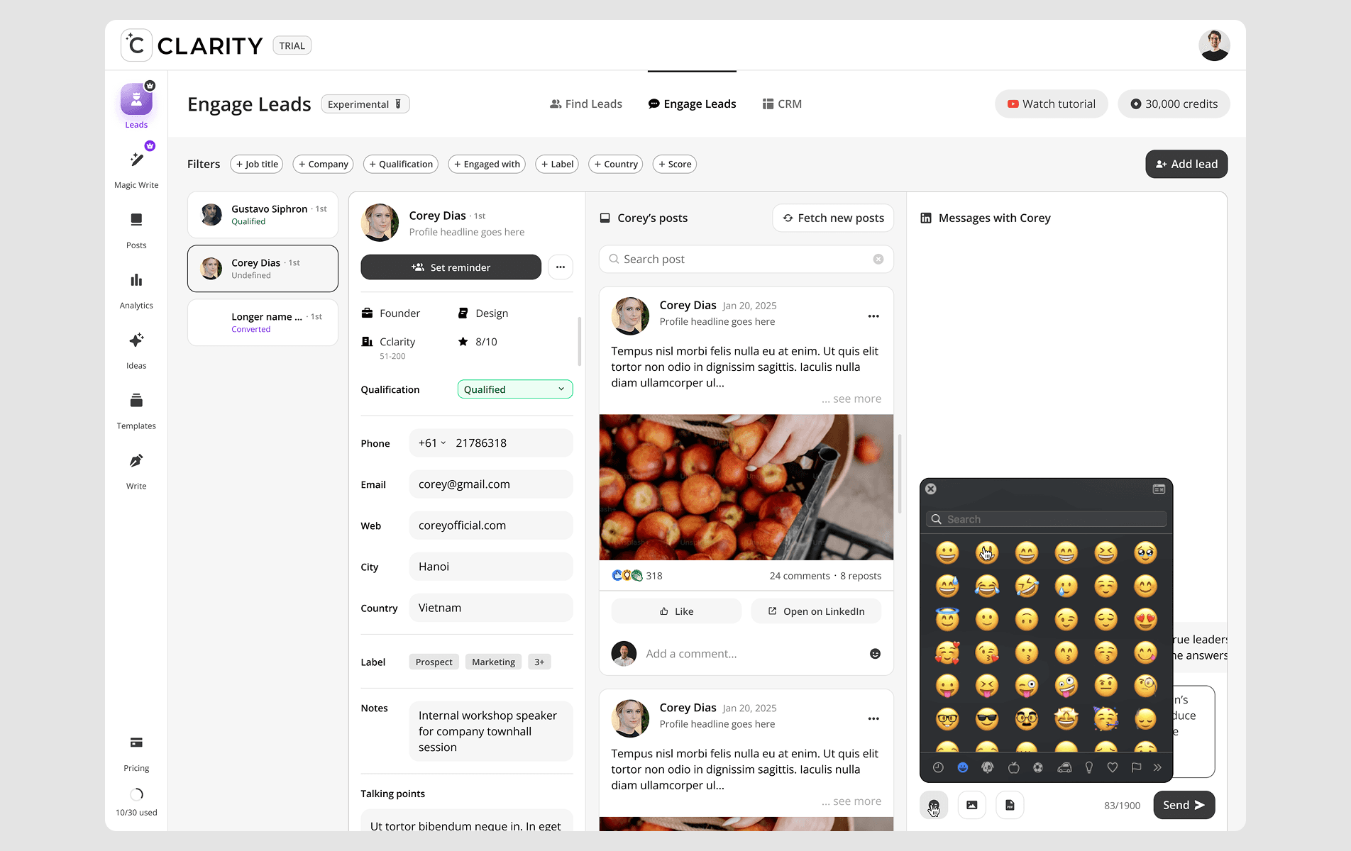 Identify leads actively looking for solutions like yours. Cclarity analyzes relevant LinkedIn posts to surface leads who are ready to engage. As founding designer for this feature, I was responsible to develop new experience to track competitors, scan and find potential leads, engage with them and manage with built-in CRM.